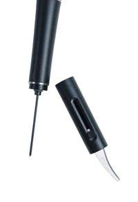Гораздо более разумной выглядит другая американская задумка – пневматический штопор-шприц. В пробку вводится игла, которая протыкает ее насквозь, в бутылку подается воздух, который просто выталкивает пробку наружу. Смотрится эффектно, но по надежности такой штопор уступает обычному, винтовому.