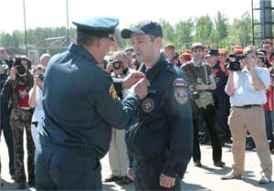 Министр по делам гражданской обороны, чрезвычайным ситуациям и ликвидации последствий стихийных бедствий Сергей Кужугетович Шойгу вручает Илье Форсееву медаль МЧС России «За отличие в ликвидации последствий чрезвычайной ситуации». Май 2010 г.